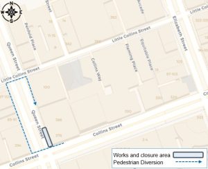 - Collins Street /Queen Street bus stop will be closed with alternative stop located further North near corner of Little Collins Street.